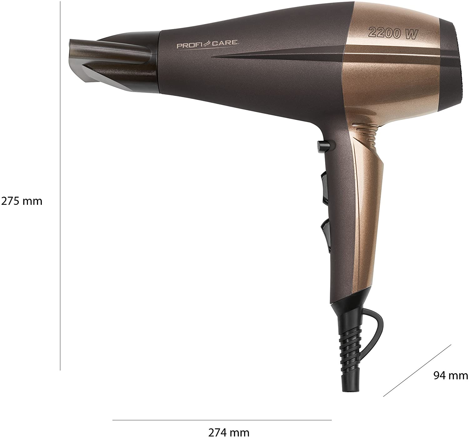 Données techniques : champagne · Dimensions produit, hauteur : 275 mm · Dimensions produit, largeur : 215 mm · Longueur : 95 mm · Niveaux de chauffage : 3 · Niveaux de ventilation : 2 · Poids : 700 g · Puissance : 2200 W · Spécificités du soin capillaire : avec fonction ionique · Type de produit : Sèche-cheveux Contenu de livraison : Sèche-cheveux,Mode d’emploi
