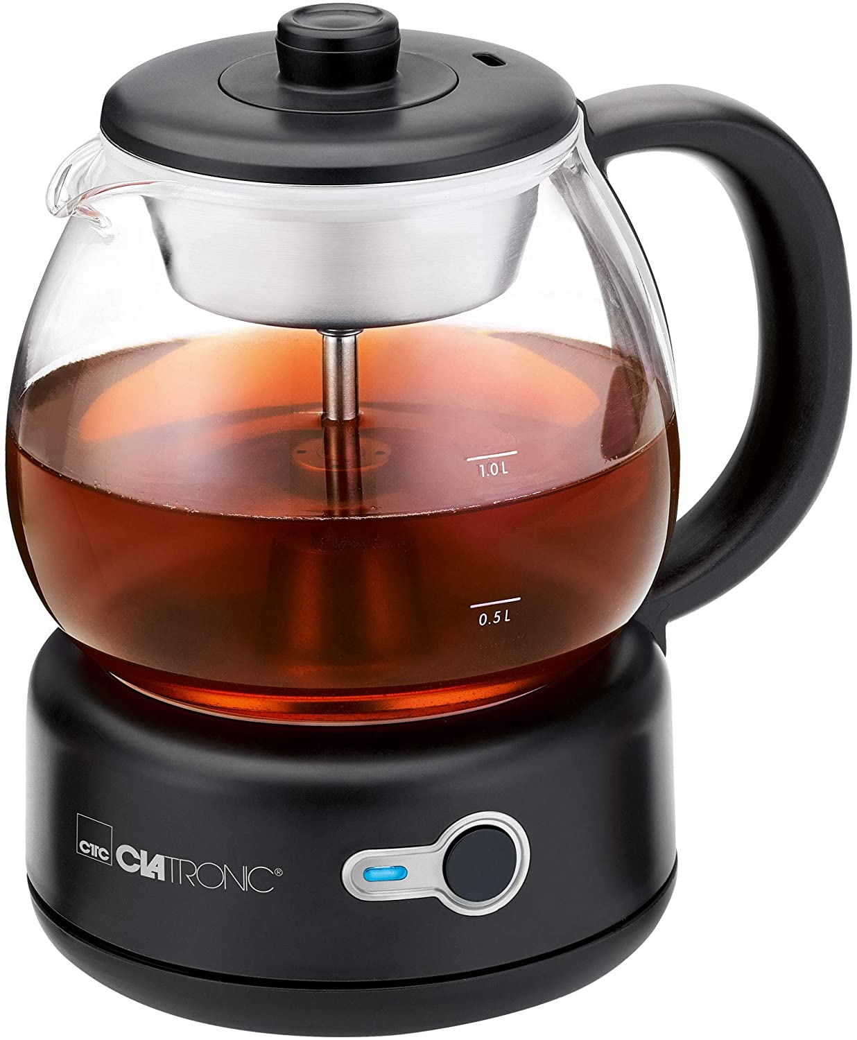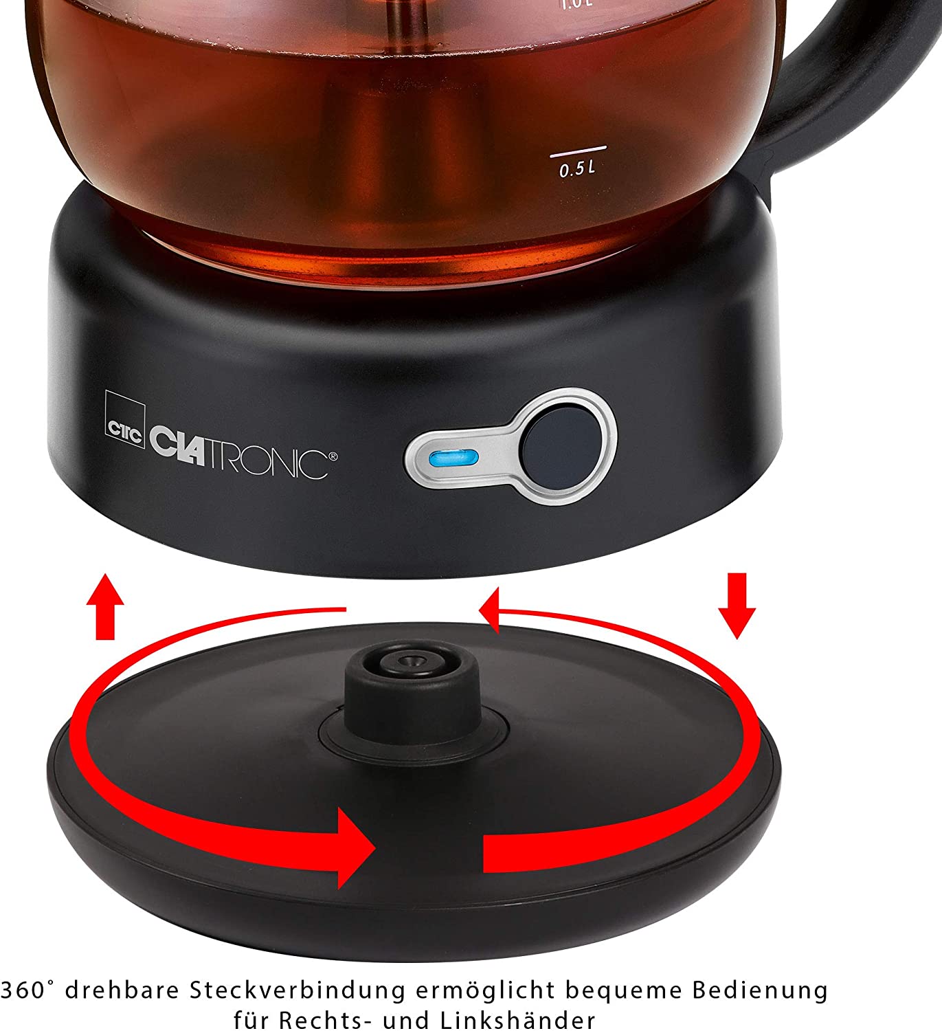 Clatronic Théière avec filtre à thé permanent en acier inoxydable (amovible), technologie sans fil, connexion rotative à 360 °, noir, verre