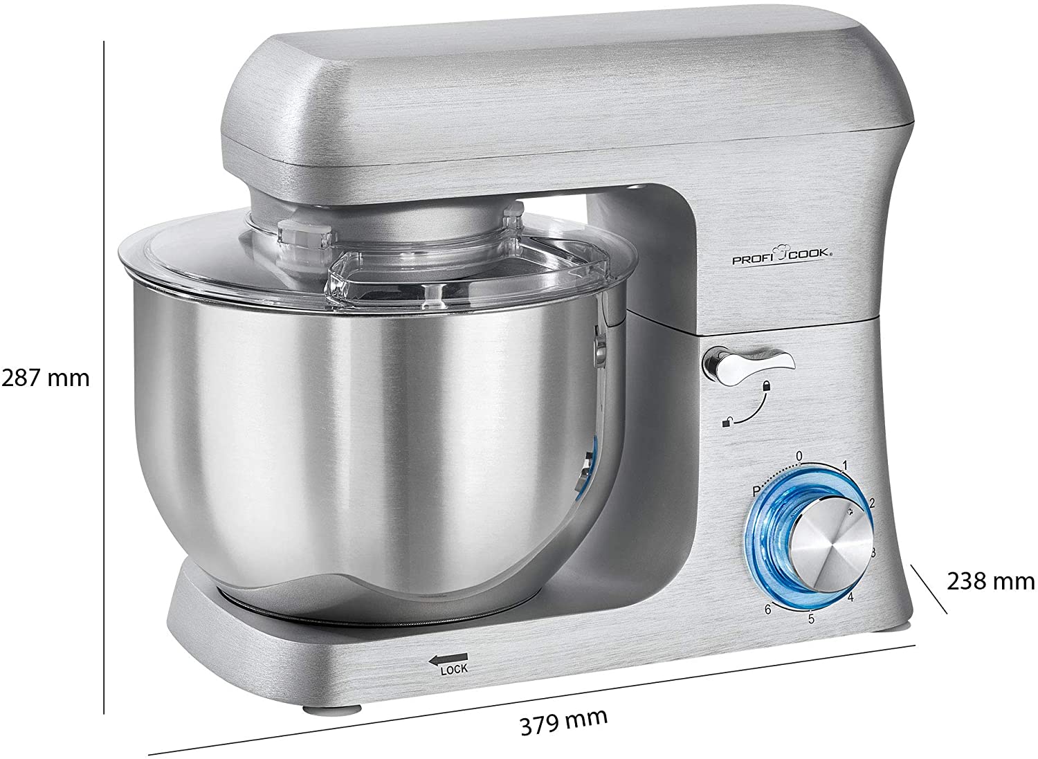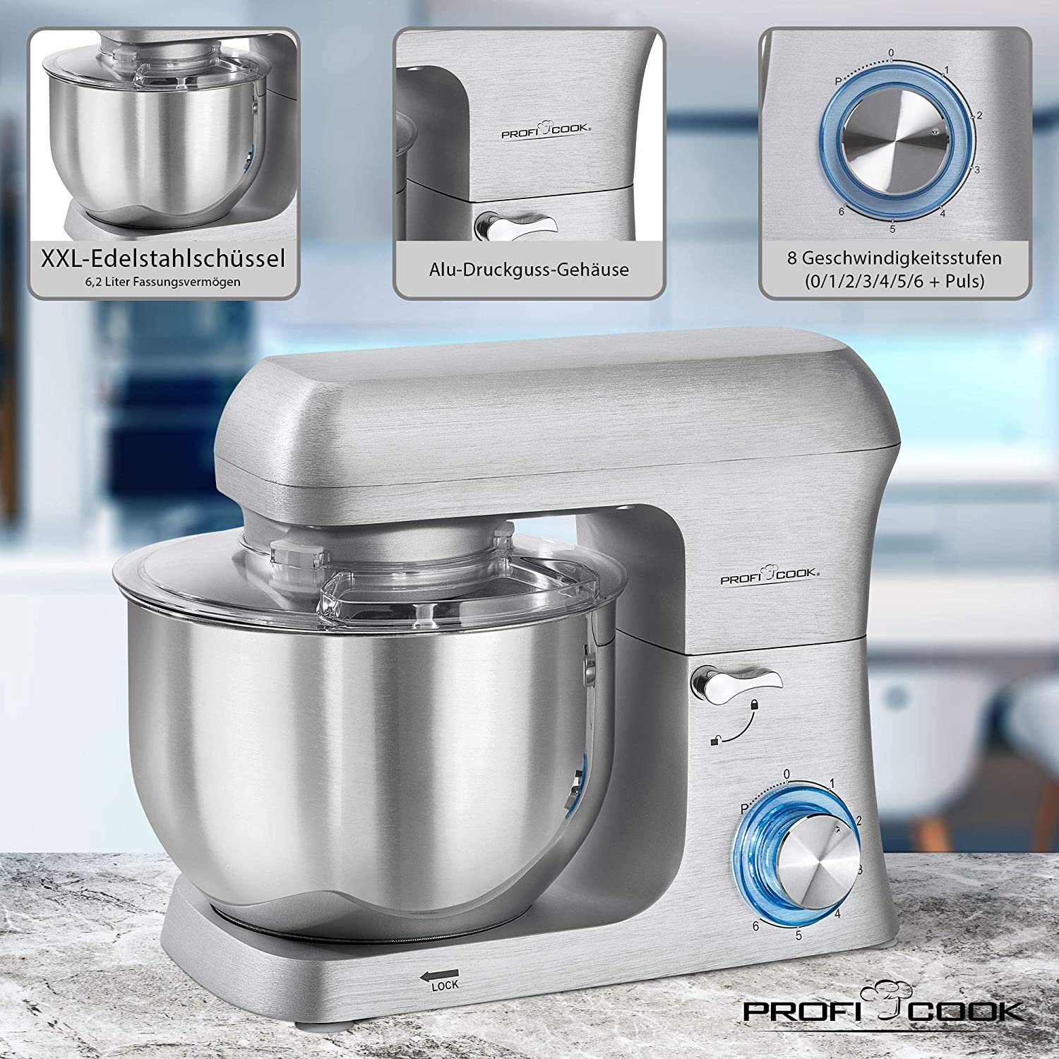 PROFI COOK PC-KM 1188 – Robot pétrin – 8 vitesses – Commandes rotatives éclairées – Bol de 6 litres – Avec acessoires – 1500 Watts – Couleur Argent