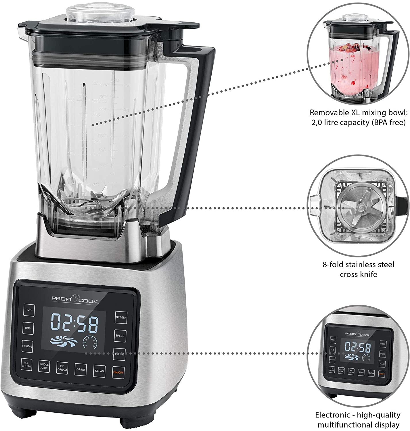 PROFI COOK PC-UM 1127 – Blender/Smoothies – Idéal pour mixer – Commande Tactile – Affichage LED – 9 fonctions – 2000 Watts – Couleur Argent et Noir