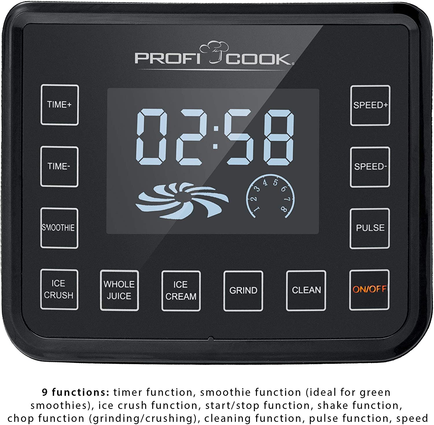 - 9 fonctions : fonction minuteur, fonction smoothie (idéal pour les smoothies verts, fonction broyage, fonction start/stop, fonction shakes, fonction chope (broyer/broyer), fonction nettoyage, fonction pulse