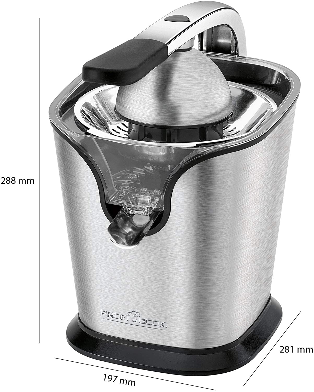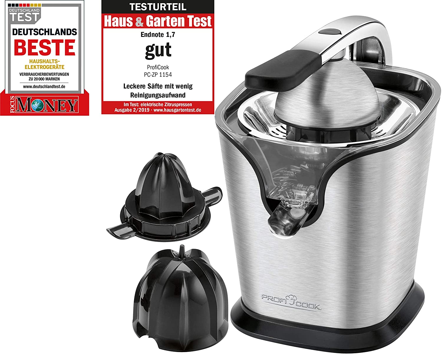PROFI COOK PC-ZP 1154 – Presse agrumes – Poignées anti touch – 2 cones de jus – Fonction anti goutte – 160 Watts – Couleur Argent et Noir