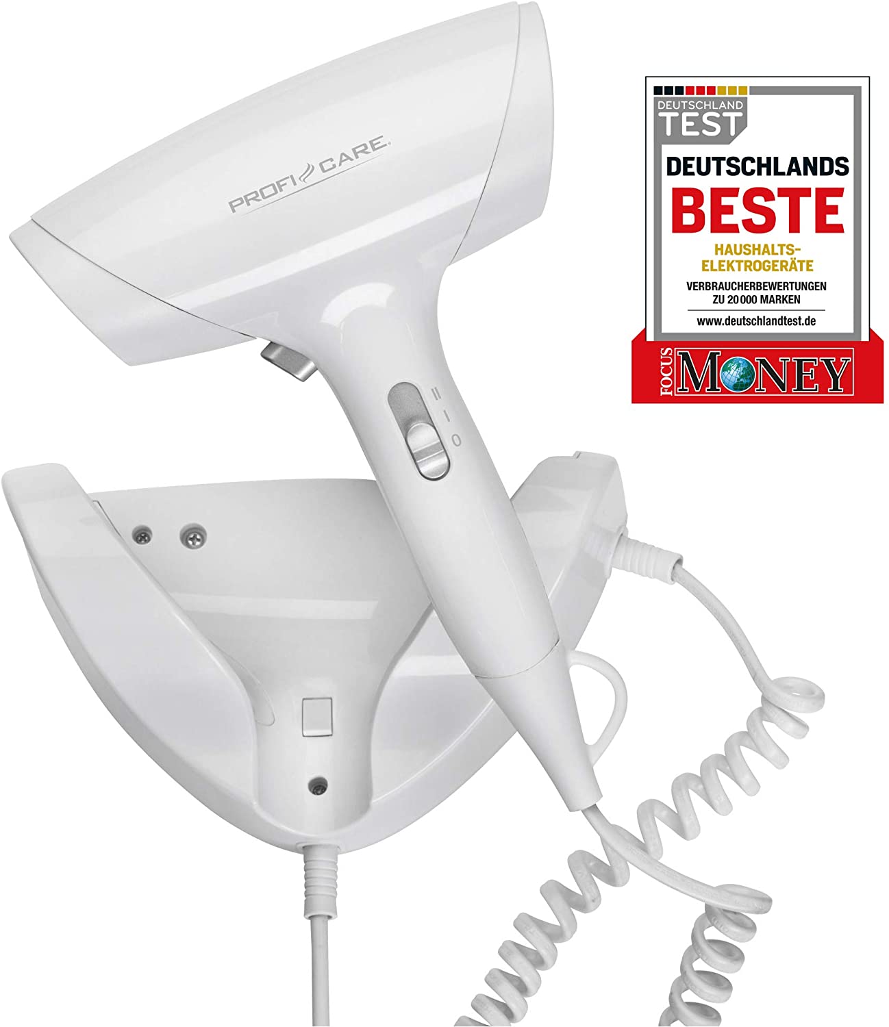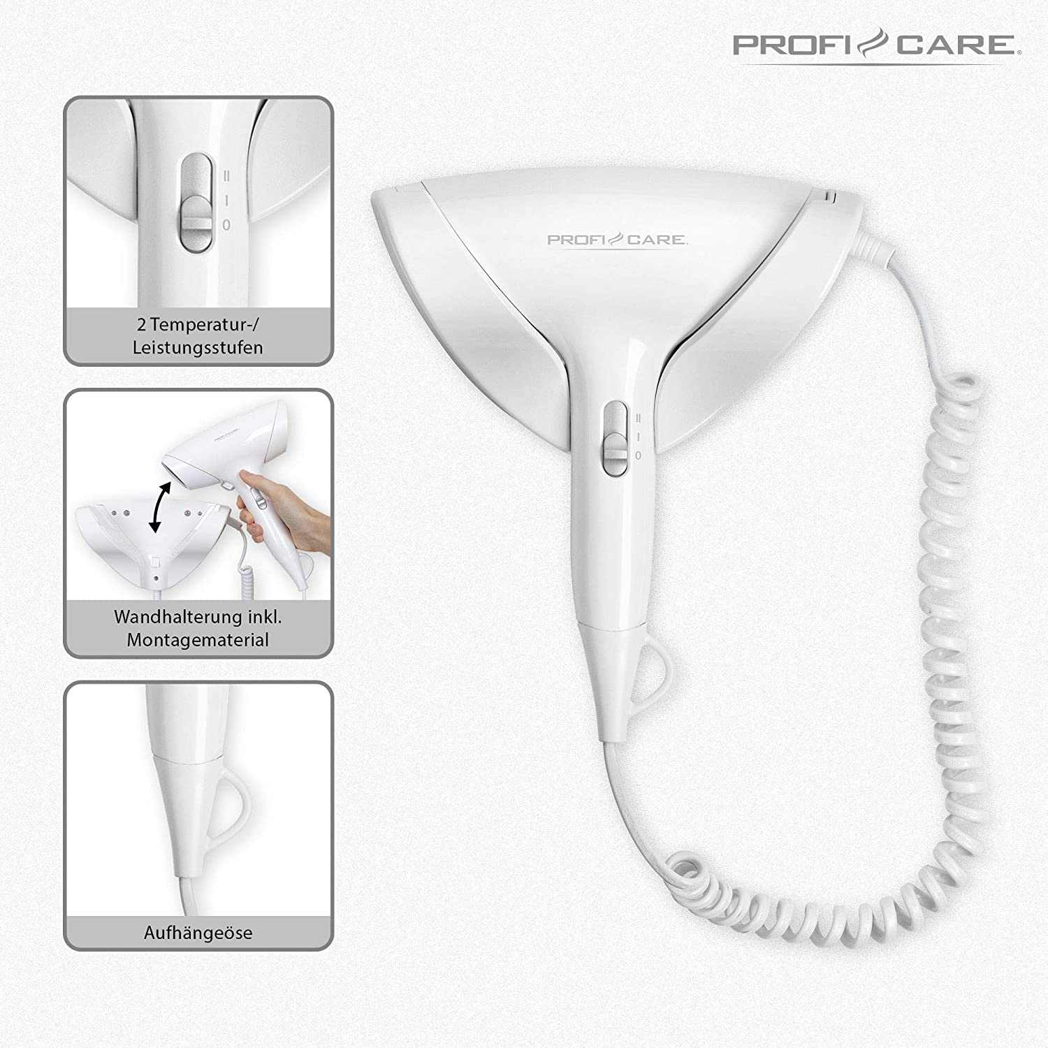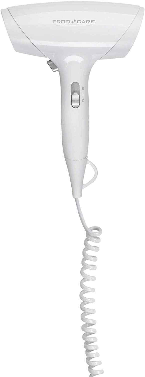 ProfiCare PC-HT 3044-Sèche-Cheveux Mural-2 Niveaux de température et de Puissance-1800 Watts-Câble Spirale Extra Long Cool Shot avec arrêt de sécurité, Blanc, Taille Unique