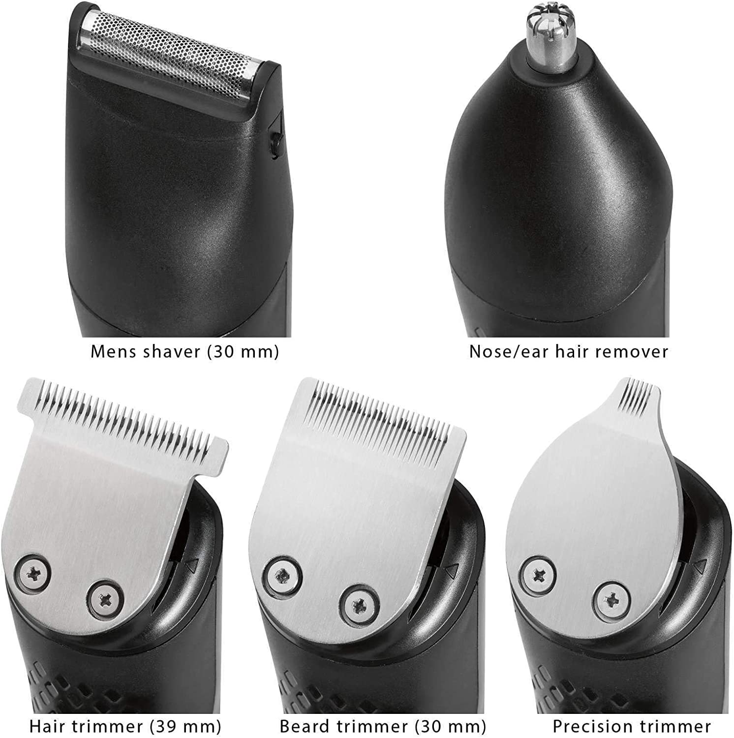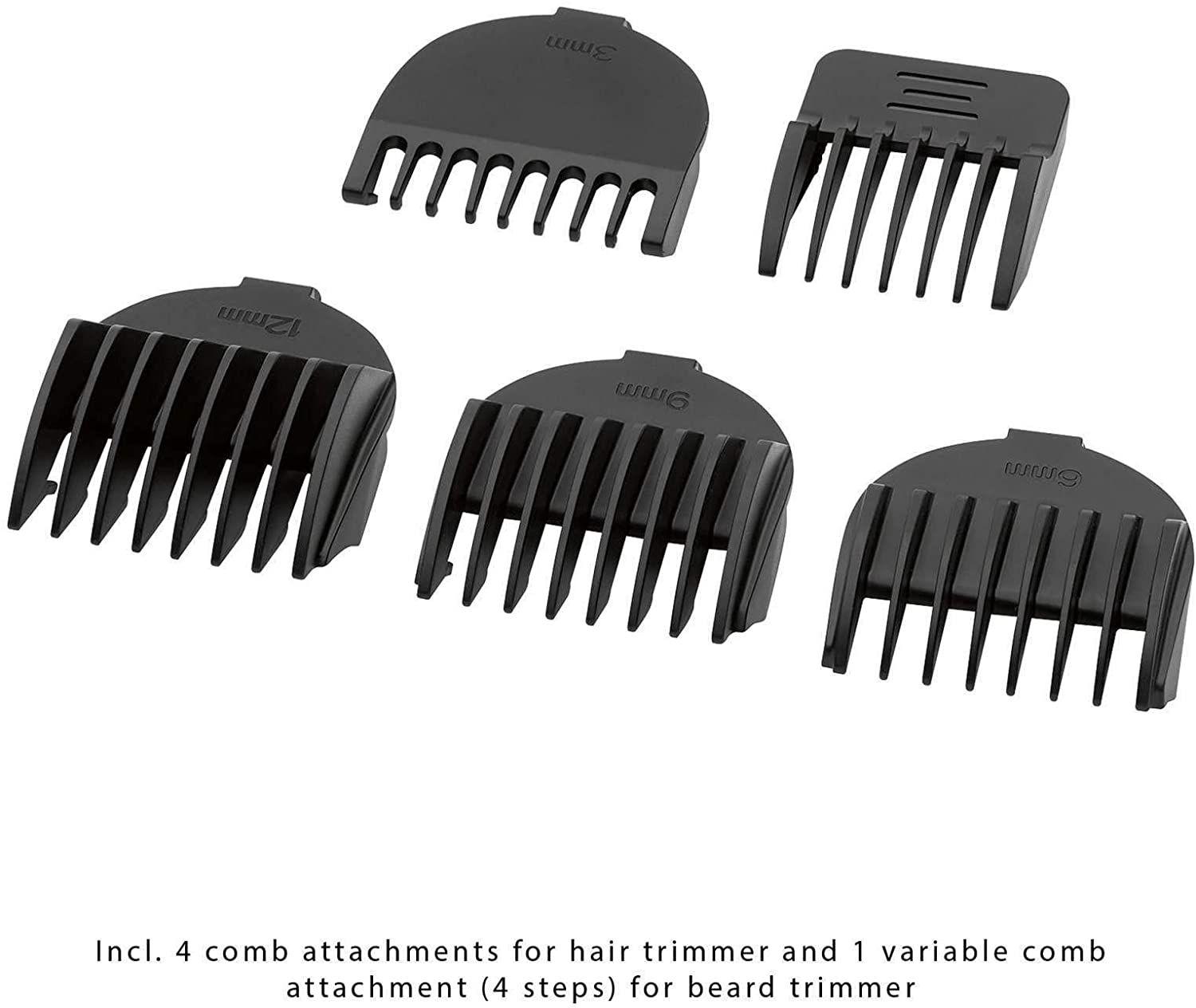 - 1x avec 4 peignes – 1x de barbe avec 1 Peigne – 1x rasoir – 1x taille de précision – 1x épilateur nasal