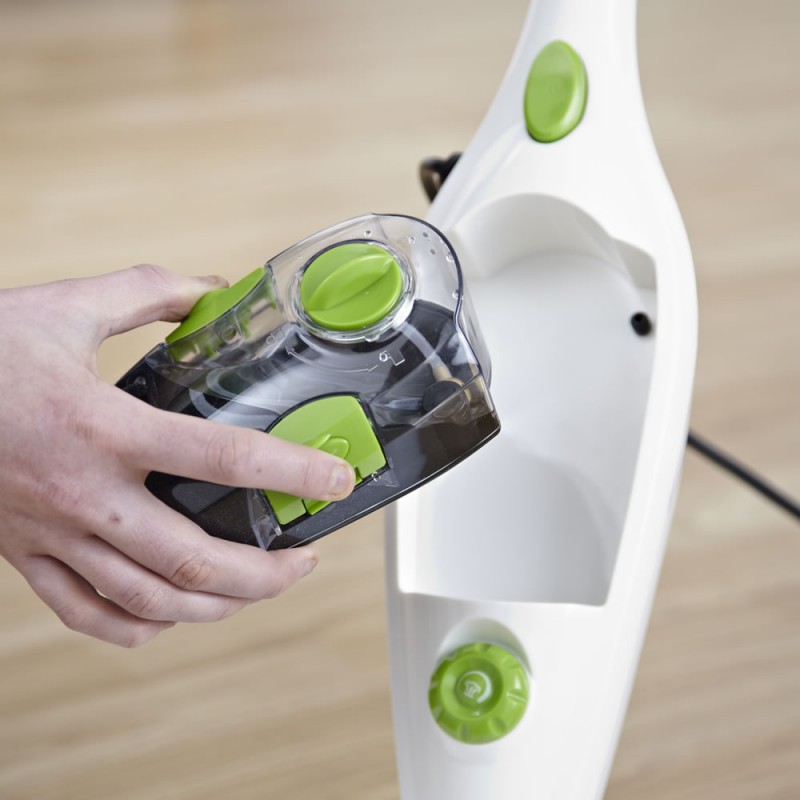 Un Balai à vapeur avec une quantité de vapeur ajustable par une touche rotatif Dans le cas où il n’y a plus d’eau dans le réservoir, un signal rouge est déclaré avec une lumière qui vous avertit du manque d’eau la pompe aussi cesse de fonctionner
